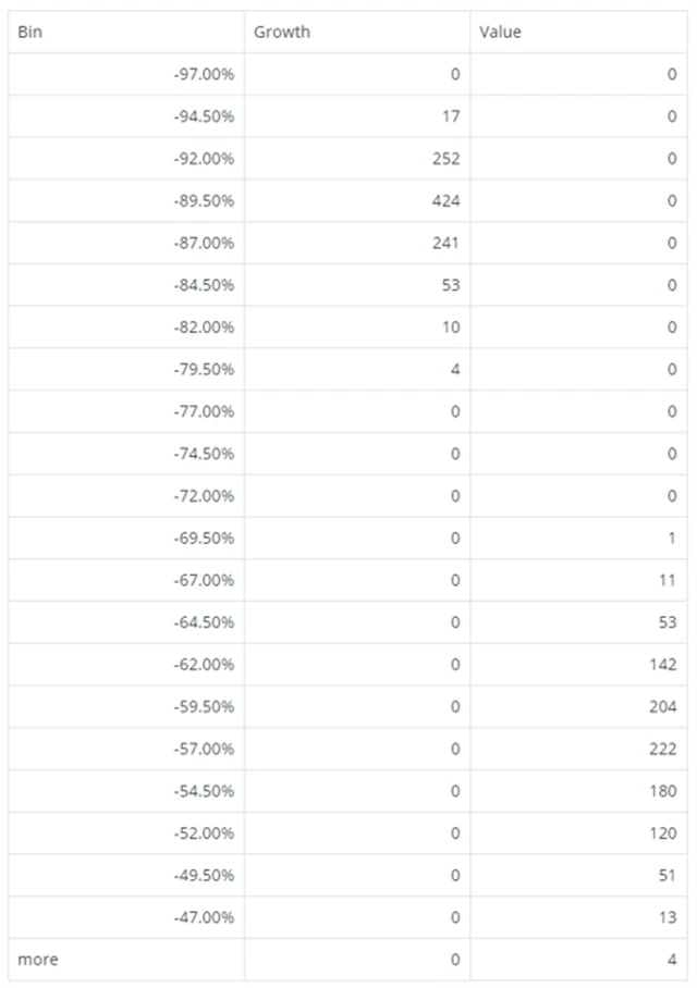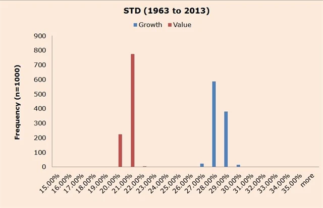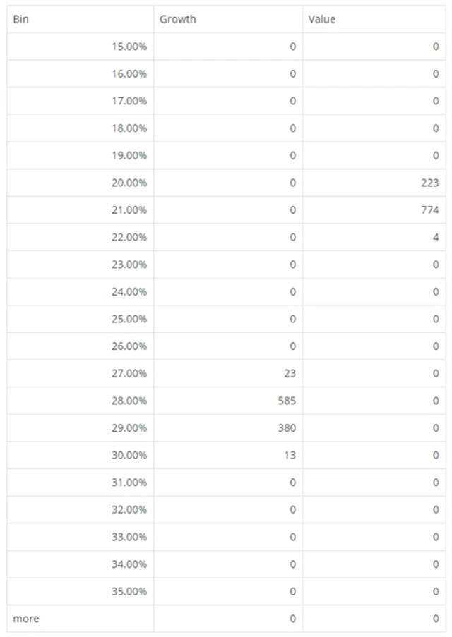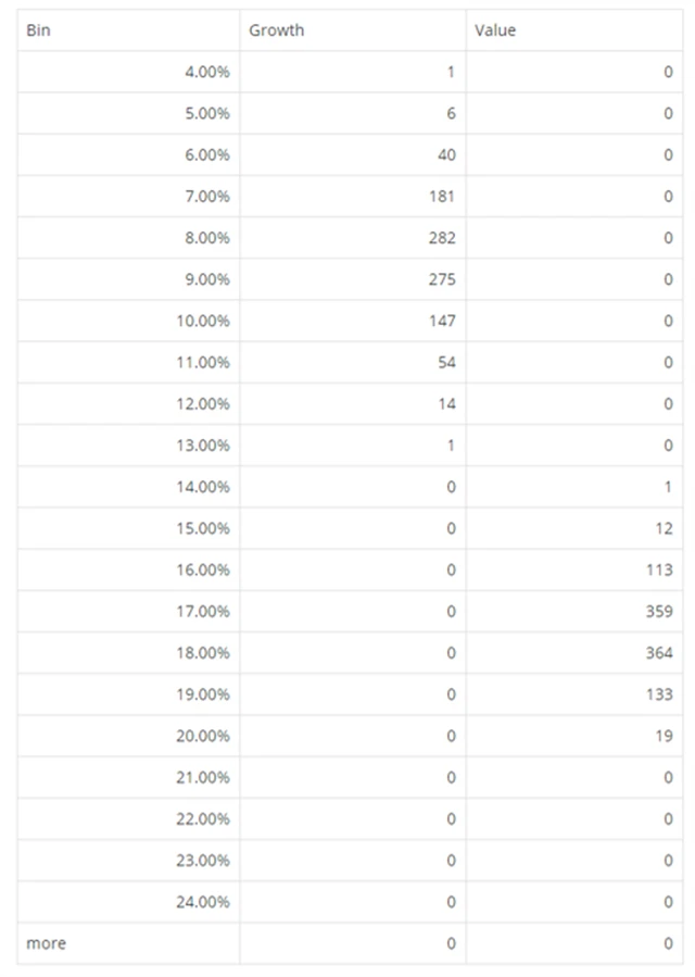Nejdříve se podívejme na rozdělení CAGR. Ani v jednom případě portfolia 30 drahých akcií nepředstihla portfolia 30 levných akcií. Níže v tabulce si všimněte odlišností rozdělení.