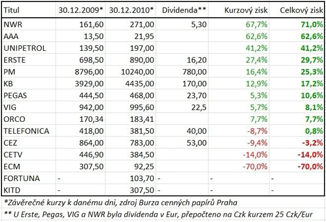 Fortuna (od uvedení na burzu -2,2 %) ani KIT digital (+56,1 %) v ní nejsou zahrnuty, protože se před rokem na BCPP ještě neobchodovaly. KIT digital by přitom patřila k růstovým hitům. Uvidíme v roce 2011.