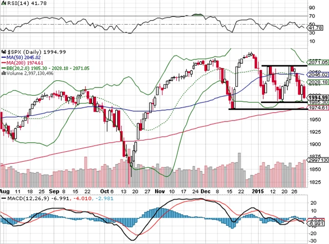 Volatilita zůstává vysoká, index S&P 500 se přesto obchoduje u spodní linie rozpětí v zóně okolo 1 990 bodů. Další hladina podpory je na 200denním klouzavém průměru a prosincových minimech u 1 975 bodů.