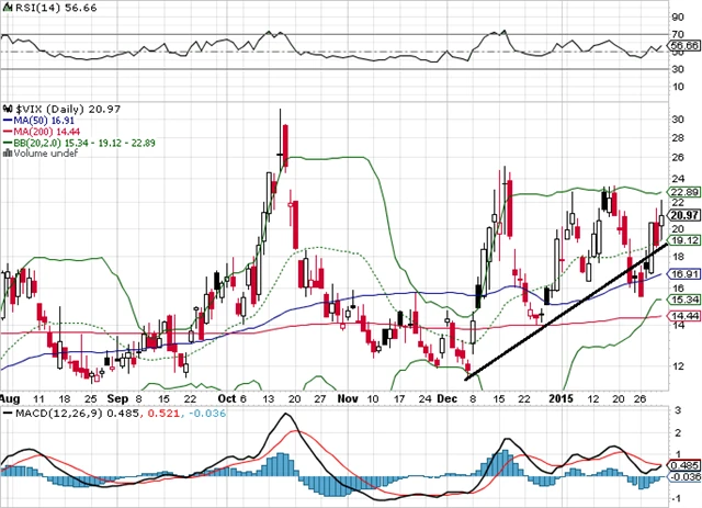 Index volatility VIX vyskočil o 26 % a vrátil se nad rostoucí trendovou čáru. Pokud "špička" na grafu začne klesat, potvrdí se pro akcie nový nákupní signál.