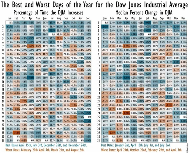 Tabulka nalevo ukazuje procento případů, kdy v daném dni trh stoupal, zatímco tabulka vpravo mediánovou procentní změnu během každého dne.