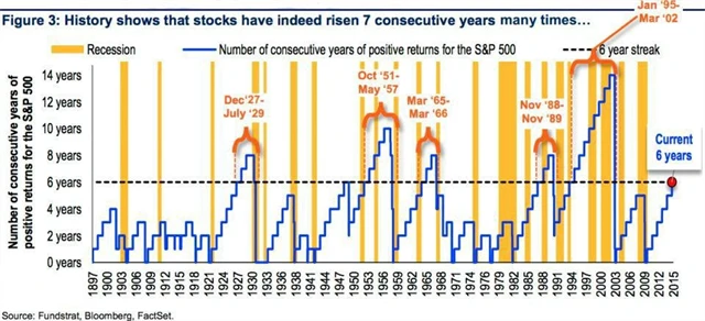 To celkem jasně vyvrací nedávno opakovaně artikulovanou "pravdu", že americké akcie ještě nikdy nenabídly 7 let růstu v řadě za sebou; platí to jen o růstech "zapisovaných" podle jednotlivých kalendářních let.