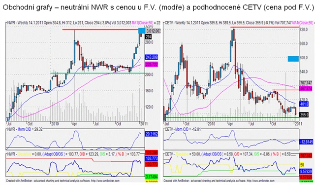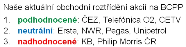 Je-li akcie pro nás nadhodnocená (cena je nad naší F.V.), pak ji do portfolia nenakupujeme (aktuálně například KB či Philip Morris). Nakupujeme především podhodnocené akcie, tedy ty, kde je cena pod férovou hodnotou (aktuálně ČEZ, CETV, Telefónica). Neutrální akcie jsou ty, kde je cena v oblasti či blízko u férové hodnoty (Erste, NWR, Pegas).