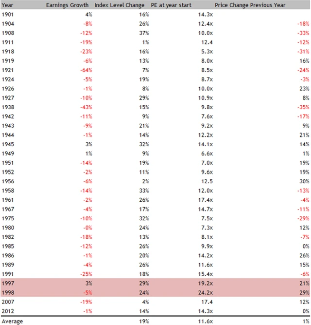 Podmínky na trzích ale byly většinou výrazně jiné, než jsou nyní, kdy zisky firem v USA mají opět růst jen nepatrně. Ze 33 případů, kdy index rostl navzdory nepříznivému vývoji zisků, bylo hned 14 takových, kdy akcie o rok dříve ztratily (trh tedy možná do cen zahrnul nízká zisková očekávání). Ocenění akcií měřené poměrem P/E (ceny akcie a zisku na akcii) bylo navíc ve zmíněných 33 letech 11,6. To je výrazně nižší než současná hodnota, akcie zkrátka byly velice levné, a tak nezřídka posilovaly, i když zisky klesaly.