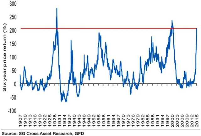 Andrew Lapthorne ze Société Générale sestavil graf šestiletých výnosů indexu S&P 500. Ten hovoří jasně. "Tak silný růst v tak krátké době trh zažil jen dvakrát, a to v letech 1929 a 1999. Ani v jednom případě před se bou trh neměl zrovna dobré roky," upozorňuje analytik.