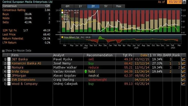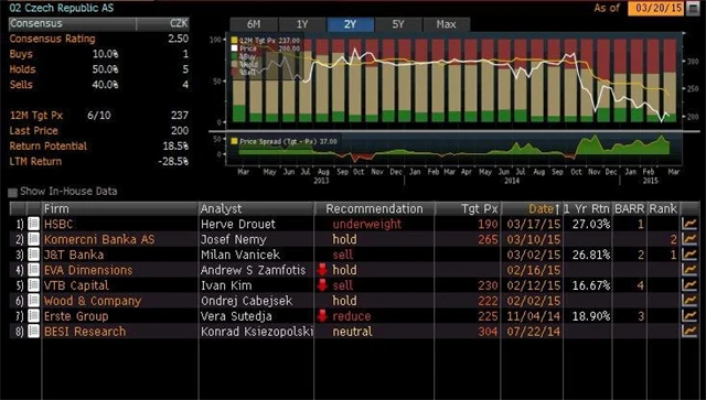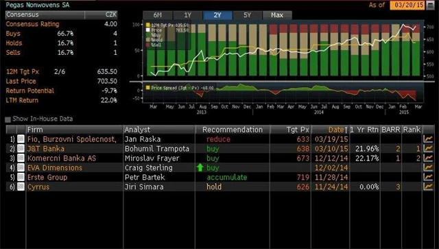 Jaký názor mají na akcie O2 Czech Republic, CME a Pegasu Nonwovens domácí a zahraniční analytici? Jaké jsou jejich dvanáctiměsíční cílové ceny a jak znějí jejich aktuální investiční doporučení? Nabízíme jejich přehled, jak jej k 20. březnu 2015 shromáždila agentura Bloomberg. (20. 3. 2015)