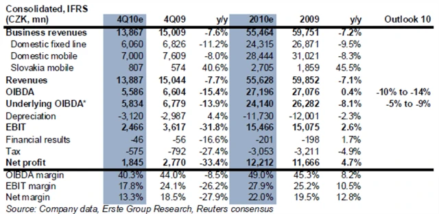 Telefónica O2 ČR zveřejní své 4Q/FY10 výsledky 18. února 2011 v 15h SEČ. Očekáváme meziroční pokles tržeb o 7,6 % především kvůli nižším výnosům z mobilního hovorného, IT služeb a pevných linek. Tuzemští uživatelé mobilních telefonů přecházeli na levnější tarify. Nová vláda rozhodla o zpoždění některých IT projektů. Slovenská pobočka by měla pokračovat v získávání dalších zákazníků a ve 4. čtvrtletí zaznamenat 40,6% meziroční nárůst tržeb. OIBDA by podle očekávání měla meziročně klesnout o 15,4 %, protože nižší provozní náklady nemohou vyrovnat vliv klesajících tržeb. Odpisy by se meziročně měly zvýšit o 4,4 % z velké části kvůli vlivu zrušení ztráty ze snížení hodnoty aktiv ve 3. čtvrtletí. Ve výsledku by čistý zisk měl zaznamenat meziroční pokles o 33,4 %.