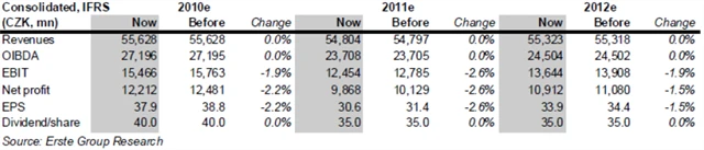 Změna v odhadech: Snižujeme odhad zisku na akcii v loňském roce o 2,2 % především kvůli vyšším odpisům. Zrušení ztráty ze snížení hodnoty aktiv ve 3. čtvrtletí vedlo k vyšší bázi aktiv pevných linek, a proto i vyšším odpisům. Odpisy by se v samostatném 4. čtvrtletí měly ve srovnání s předchozím čtvrtletím zvýšit o asi 160 mil. Kč.