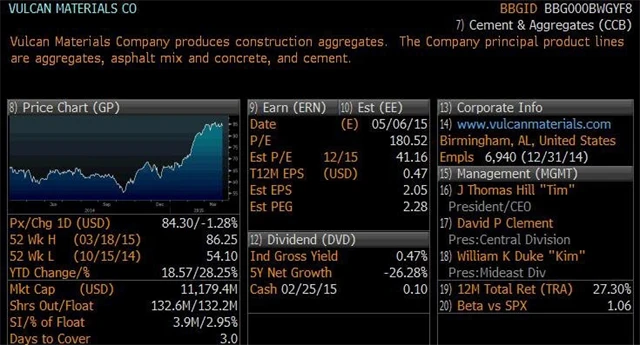 Podobně jako Martin Marietta se i Vulcan Materials angažuje ve výrobě stavebních materiálů a mělo by jí nahrávat oživení americké ekonomiky. Vulcan provedla akvizici některých aktiv Martin Marietta v rámci antitrustového procesu v souvislosti s akvizicí Texas Industries. Na trhu je nyní duopol Vulcan a Martin Marietta. Silné zisky ve čtvrtém čtvttletí potvrdily trend zlepšujících se finančních ukazatelů a přispěly k růstovému momentu akcií Vulcan v roce 2015.