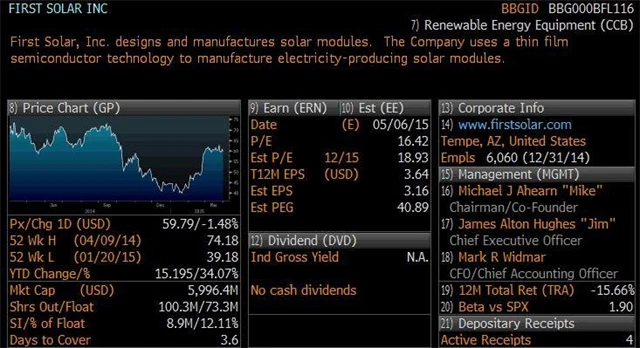 First Solar je pro některé investory trochu překvapením vzhledem k těžkým časům pro energetické akcie. Když je ropa tak levná, na co potřebuje svět drahou solární energii? Někteří investoři ale správně vsadili na to, že každá akcie, která utrpěla výprodeje, se brzy zotaví. Poté, co First Solar ztratila kolem 40 % v posledních 9 měsících roku 2014, se oklepala a vydala do dalšího boje. Očekává se, že vznikne joint venture se SunPower, což by mohlo vést k tvorbě předvídatelné cash flow a zajistit stabilitu jinak celkem volatilní akcii. Akvizice Solar Chile by zase mohla otevřít cestu na mladé trhy. Pak by akcie First Solar mohly dále posilovat navzdory nejistému prostředí na energetickém trhu.