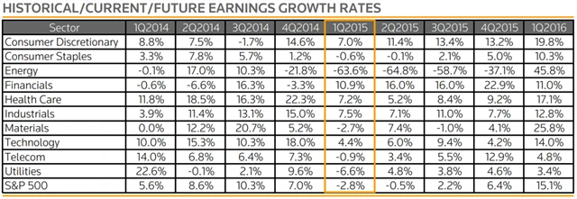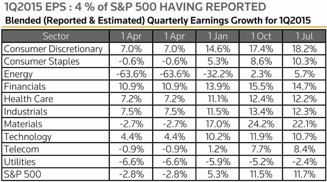 Analytici oslovení agenturou Thomson Reuters od léta 2014 očekávali nejdříve dvojciferné tempo růstu zisků amerických firem v prvním čtvrtletí 2015, postupně jej revidovali níže na jednociferné míry, až se svými odhady klesli do mínusu. Na začátku dubna tak počítají s poklesem o 2,8 % ve srovnání s minulým silným růstem o 7 %.