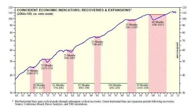 - Index po zotavení v průměru posílil o dalších 18,6 %, než začal opět klesat, a trvalo mu to 65 měsíců. Podle těchto průměrů by současné ekonomické zotavení USA mělo trvat ještě 47 měsíců, tedy do března 2019.
