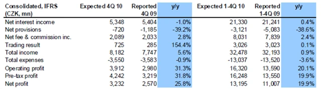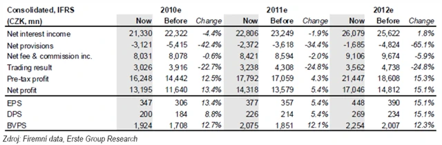 Komerční banka se v současnosti obchoduje pouze asi 5 % pod svým historickým maximem. Navíc s 2,1násobkem účetní hodnoty je Komerční banka oceněna s 40% prémií vůči konkurenci, která u tohoto ukazatele v průměru dosahuje 1,5 násobku. Analytici České spořitelny jsou proto v předvečer výsledků za rok 2010 konzervativní a doporučují akcie "držet".