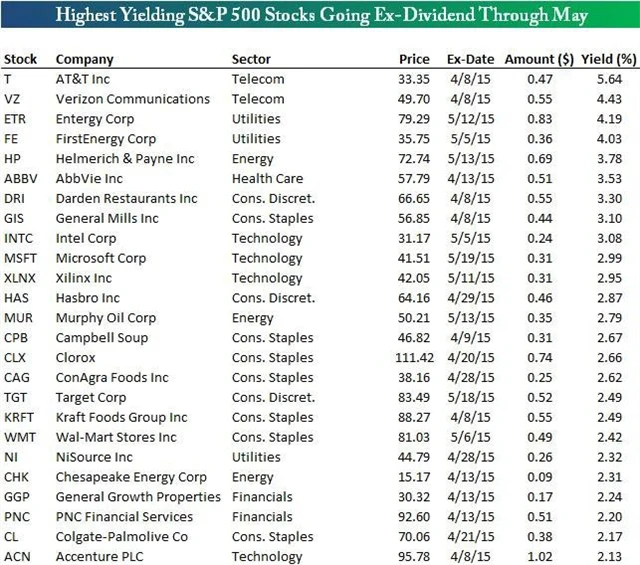 V nejsledovanějším americkém akciovém benchmarku S&P 500 udělaly investorům na začátku dubna největší radost akcie mobilního operátora AT&T (dividenda 0,47 USD na akcii, výnos 5,64 %) a operátora Verizon Communications (dividenda 0,55 USD na akcii, výnos 4,43 %). U těchto dvou cenných papírů již ovšem investoři, kteří je nedrželi k 7. dubnu, mají smůlu.