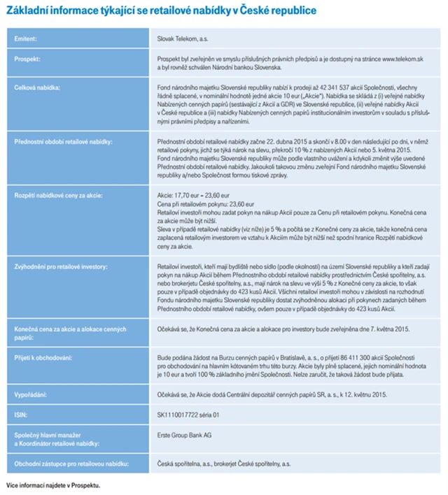 Pokyny k nákupu akcií společnosti Slovak Telekom, které na trh uvede Fond národního majetku Slovenské republiky, mohou investoři podávat na vybraných pobočkách České spořitelny a také on-line prostřednictvím brokerjetu České spořitelny.