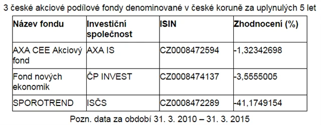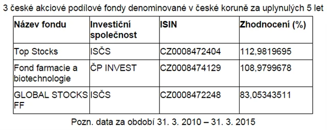 Nejvýkonnější český akciový podílový fond denominovaný v české koruně zhodnotil v uplynulých 5 letech prostředky svých klientů o 112,98 %. Hodnota nejméně výkonného českého akciového podílového fondu klesla ve stejném období o 41,17 %.