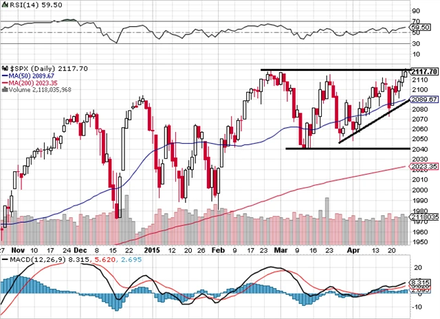 Po proražení rezistence 2 120 by dalším cílem pro index S&P 500 byla hladina 2 150. V posledním dubnovém týdnu bude pokračovat vyhlašování hospodářských výsledků, důležitým faktorem pro vývoj cen akcií se ale pravděpodobně stane také zveřejněný předběžný odhad vývoje amerického HDP v prvním čtvrtletí.
