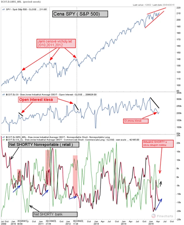 Aktuálně vzniká podobná situace. Podobně jako nyní to vypadalo před cenovými vrcholy v dubnu nebo květnu v letech 2010, 2011 a 2012. Net SHORT pozice bank se drží u maxim a již nerostou, Net SHORT pozice retailovách obchodníků pomalu rostou a open interest klesá.