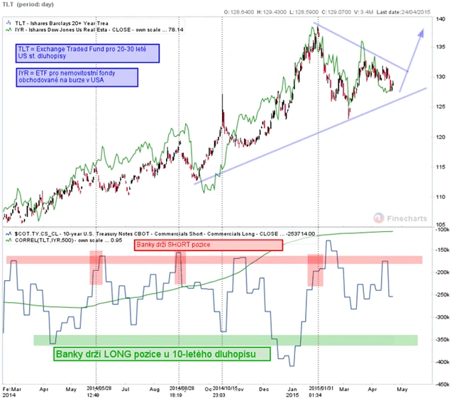 V grafu níže jsou nahoře ceny ETF s označením TLT a IYR. Dole jsou Net SHORT pozice bank v amerických 10letých vládních dluhopisech (TY). Pozice bank jsou nyní neutrální, nepřevažují SHORT ani LONG pozice. Je tedy možné, že korekce na trhu s dluhopisy ještě není u konce, ale řekl bych, že již nebude pokračovat dlouho.