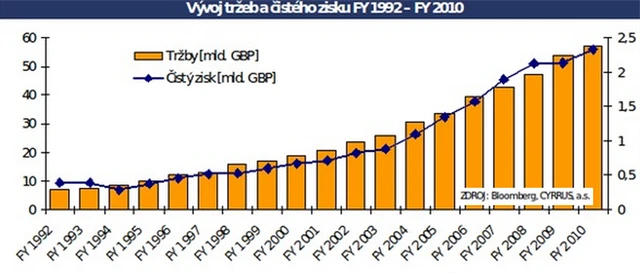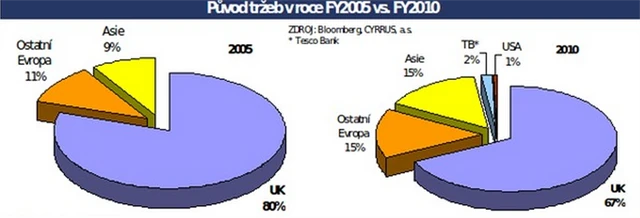 Ve srovnání s rokem 2005 je proto pochopitelná geografická diverzifikace aktivit společnosti z Evropy na asijský kontinent. **Zatímco před pěti lety pocházelo 80 % tržeb z domácí Anglie, nyní je to o 13 % méně, roste naopak podíl tržeb z Evropy (15 %) a z Asie (z 9 % na 15 %).
