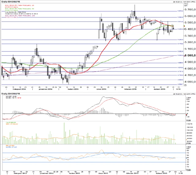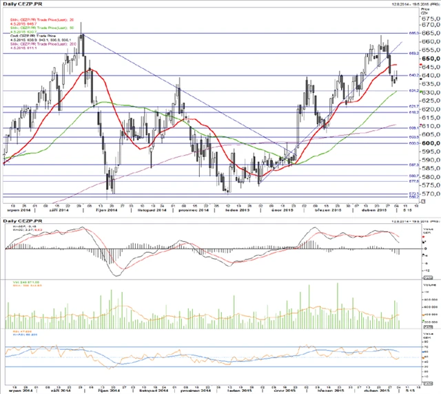 Technická analýza cen akcií ČEZ a Komerční banky. (5. 5. 2015)