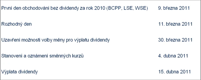 Výše dividendy k výplatě v librách šterlinků, českých korunách a polských zlotých bude určena podle směnného kurzu k euru platného k 4. dubnu 2011.