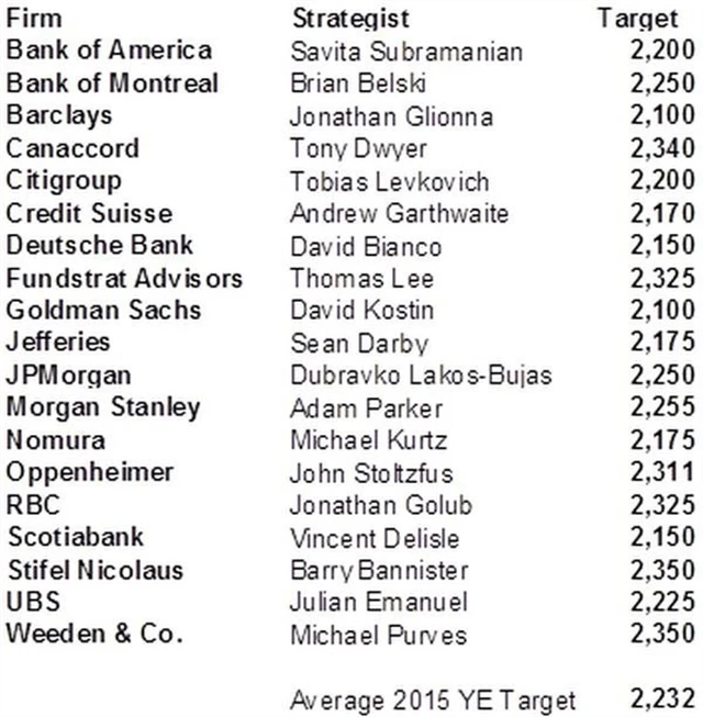 Až na výjimky přisuzují tržní experti hlavnímu americkému indexu do konce roku potenciál růstu, v průměru zhruba o 5 %. To by znamenalo za rok historicky průměrné zhodnocení (rok 2014 S&P 500 zakončil na 2 058,90 bodu). Je ale potřeba připomenout, že akcie posilují již sedmým rokem a ode dna v březnu 2009 S&P 500 přidal 220 %.