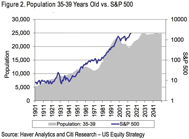 Silná generace baby boomers v USA stárne, což by mělo vést ke konzervativnějším alokacím investic velkého množství drobných investorů. Podle Tobiase Levkoviche ze Citigroup ale baby boomers měli více dětí, než bylo jich samotných, což má akcie dlouhodobě podporovat. Děti baby boomers dospívají do věku 35-39 let, kdy již mívají Američané zařízený první dům a zplozeny první děti. Čas začít spořit. A kde jinde, než investicemi do amerických akcií.