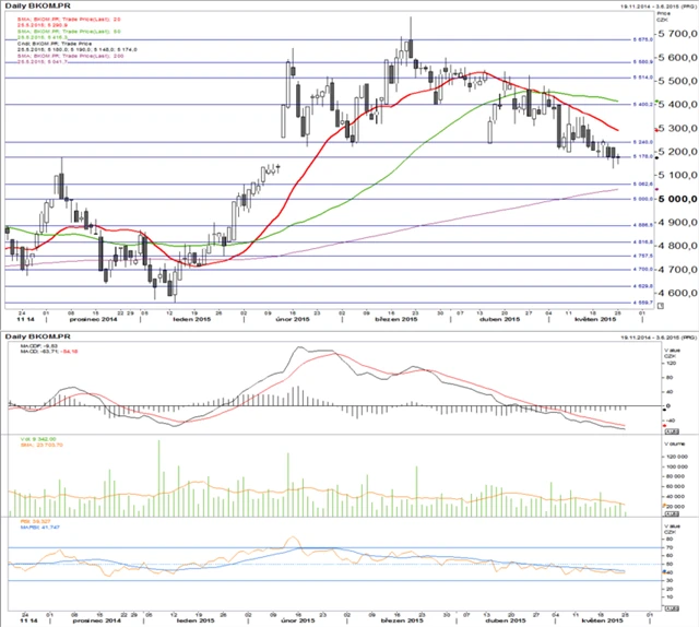 Technická analýza cen akcií ČEZ a Komerční banky. (26. 5. 2015)