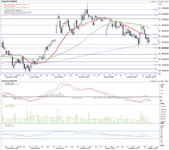 Technické indikátory jsou celkově spíše negativní. Akcie Komerční banky pravděpodobně budou opět testovat 200denní klouzavý průměr. I vzhledem k blízkosti psychologické úrovně 5 000 Kč očekáváme, že se nad ním udrží.