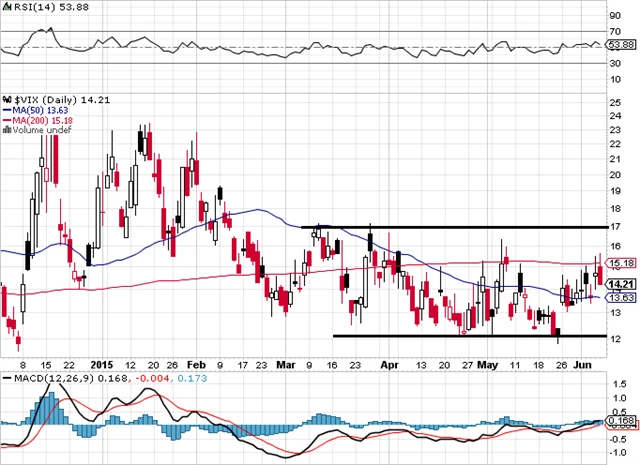 Index volatility VIX se drží v polovině 12-17 a pro akcie nadále nevysílá prodejní signál.