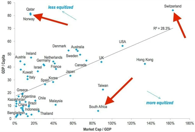 Je otázka, zda byla první slepice, nebo vejce. Je ale jisté, že čím vyspělejší ekonomika, tím zpravidla větší celková tržní kapitalizace veřejně obchodovaných firem ve vztahu k velikosti samotné ekonomiky.