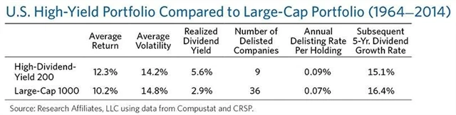 Průměrný dividendový výnos akcií 200 podniků vyplácejících vysoké dividendy v poměru k ceně akcie mezi lety 1964 a 2014 dosáhl 5,6 %, zatímco portfolio sestavené z akcií tisícovky firem s velkou tržní kapitalizací nabídlo ve stejném období dividendový výnos jen 2,9 %. Celkový roční výnos dosahoval u portfolia složeného z dividendových akcií 12,3 %, zatímco portfolio složené z cenných papírů největších firem vydělalo každý rok v průměru jen 10,2 %. Průměrná volatilita obou portfolií byla velmi podobná (14,2 % u dividendového portfolia vs. 14,8 % u portfolia složeného z akcií velkých firem).
