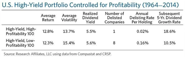 Portfolio složené z akcií firem s vysokou ziskovostí, které jsou ochotny se o zisky dělit s investory, sice v letech 1964 až 2014 nabídlo o desetinu procentního bodu nižší roční dividendový výnos než portfolio sestavené z dividendových akcií společností s nízkou ziskovostí, z pohledu celkové výkonnosti však dopadlo lépe (12,8 % proti 12,3 %), navíc ještě při nižší kolísavosti (13,7 % proti 15,4 %). Podobné je to i u dalších ukazatelů dokládajících kondici firmy, například míry zadlužení.