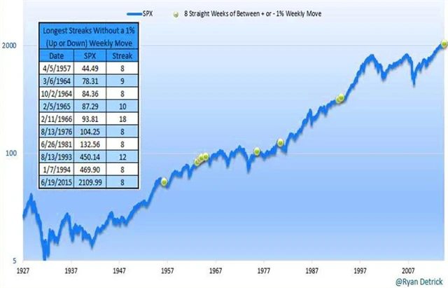 Technický analytik Ryan Detrick upozorňuje na to, že index S&P 500 k minulému pátku již osm týdnů zakončil s menší než 1% změnou (do plusu či do mínusu). To je nejdelší takto dlouhá série týdnů za 21 let.