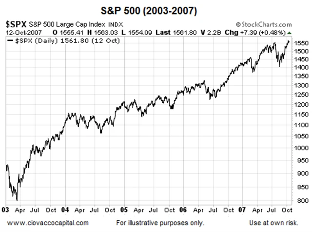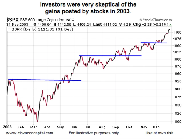 Bill Smead, portfoliomanažer Smead Value, poznamenává, že "sentiment v roce 2003 odpovídal tomu, že technologické akcie zažily velké výprodeje a index ztratil 40 %". Velká část tehdejšího růstu cen tak probíhala za nezájmu těchto zklamaných investorů.