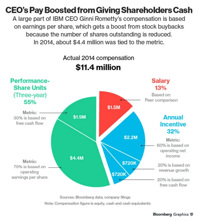 V IBM bylo téměř 40 % loňského 11,4milionového balíčku odměn pro Ginnu Romettyovou navázáno na provozní zisk na akcii. Naproti tomu Intel, Hewlett-Packard a Oracle zisky na akcii pro kalkulaci odměn managementu nevyužívaly. IBM přitom loni sklidila kritiku od analytiků a investorů za údajně přemrštěné odkupy akcií. Firma vrátila akcionářům přes 13 miliard USD, což je čtvrtá nejvyšší částka v USA. Přitom firma těžce zápasí s rozvojem cloudových služeb. Navzdory 12 čtvrtletím poklesu tržeb v řadě v 9 z nich IBM zvýšila provozní zisk, a to právě s pomocí zpětných odkupů. Letos zredukovala plánované odkupy na zhruba 6,3 miliardy USD. To je nejnižší suma za posledních 11 let.