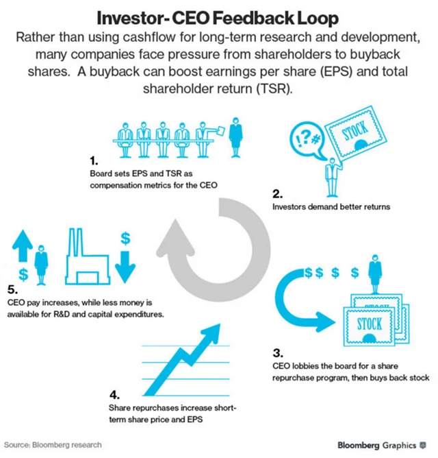 "Vazby systému odměn manažerů na programy odkupů a výplaty dividend mohou povzbudit manažery, aby z firem vyvedli peníze, které by jinak mohly být využity pro dlouhodobé investice," tvrdí ekonom William Lazonick. Také to zvyšuje pravděpodobnost toho, že budou manažeři placeni jen za krátkodobé výnosy, místo toho, aby pořádně řídili firmy. "Mnozí jen vytvářejí peníze bez toho, aby vytvářeli hodnotu," tvrdí Lazonick, který se zaměřuje na inovace a ekonomický rozvoj a píše o ekonomických efektech zpětných odkupů pro Harvard Business Review.
