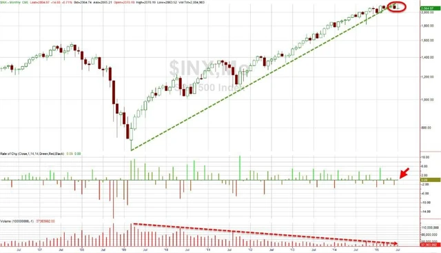 Index S&P 500 se již delší dobu převaluje v relativně úzkém obchodním pásmu. Stačí se ale podívat na měsíční graf, aby bylo patrné, že navzdory technicky stále trvajícímu býčímu trhu došlo v posledním měsíci k prolomení opticky velice významné trendové linie.