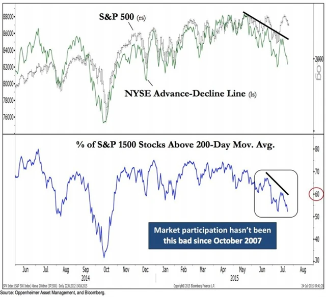 Graf z dílny Oppenheimer Asset Management pak ukazuje, že se na stále relativně slušném výkonu amerických akcií, respektive jejich setrvávání poblíž historických maxim, podílí stále méně titulů. Rozhodujícím "indikátorem" ale jako vždy bude nakonec cena (hodnota indexů) samotná, která se někdy i navzdory řadě pohybů "pod povrchem" vyvíjí naoko tak, jak se jí zlíbí.