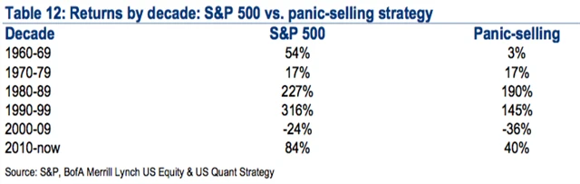 Co se stane investorům, kteří v panice prodávají při každém náznaku obratu trendu? Subramanian srovnala výsledky strategie "kup a drž" se strategií "v panice prodávej" od začátku 60. let. "Modelově jsme si pracovali s tím, že investor prodával po alespoň 2% denním poklesu trhu a nakupoval za 20 obchodních dnů, kdy byl trh na úrovni před poklesem nebo mírně výše. Taková strategie, celkem podle očekávání, zaostala za trhem v každé dekádě. Nejvíce růstové dny totiž často přicházejí po největších propadech," uvedla šéfka akciových stratégů banky.