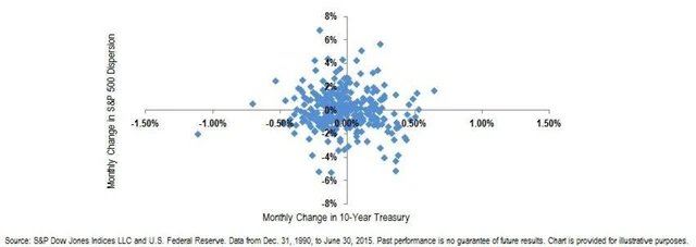 2. Rozptyl akciového trhu. Pokud se komponenty akciového trhu pohybují svorně, je rozptyl nízký a aktivní řízení portfolia (výběr jednotlivých akcií) nemá valný smysl. Rozptyl se zvýšil v červenci a lze očekávat, že tento trend bude pokračovat. Jak ale ukazují historická data, neexistuje spolehlivý vztah mezi změnami rozptylu a úrokových sazeb.