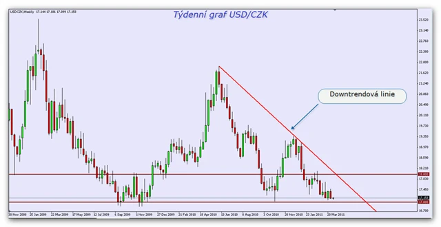 Z dlouhodobého pohledu je měnový pár USD/CZK v downtrendu. Minulý týden byl opět ve znamení posilování koruny. Cena se dostala až na úroveň 17,13. V následujících dvou týdnech můžeme očekávat otestování silné úrovně supportu na ceně 17 korun za americký dolar. Předpokládáme, že dojde k odražení a dolar bude opět mírně posilovat. Důležité hranice v následujících dvou týdnech budou 17,00 a 17,50.