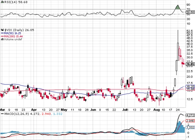 Index volatility VIX se v pondělí dostal až nad 50, což byl "výlet", jaký nepamatujeme řadu let. Během týdne se vrátil pod 30, ale i tak je na dvojnásobku oproti běžným hodnotám z posledních let. Následující období by tedy na trzích mohlo být volatilnější. Pro akcie nyní VIX nadále vysílá negativní signál.