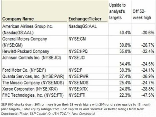 Následujících devět akciových tipů má na svědomí společnost S&P Capital IQ. Každý z těchto titulů klesl alespoň o 20 % ze svých maxim (je v medvědím trendu), má v 18měsíčním horizontu minimálně 20% růstový potenciál, je Wall Street hodnocen jako "buy" nebo "outperform", má nejvyšší hodnocení podle kritérií S&P Capital IQ a je hodnocen nejhůře neutrálně analytickou společností New Constructs.