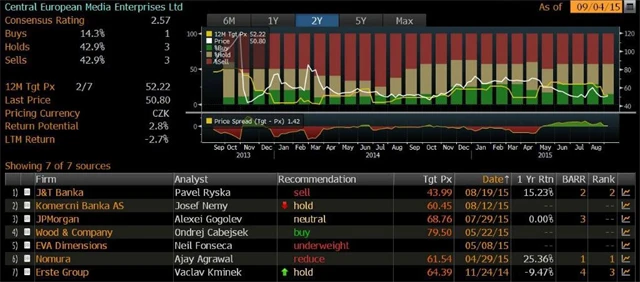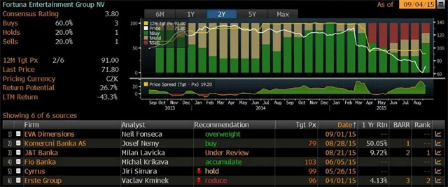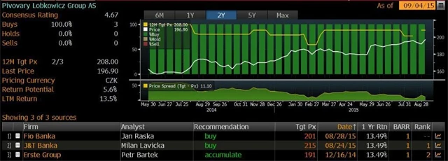 Jaký názor mají na akcie Pivovary Lobkowicz Group, Fortuna a CETV domácí a zahraniční analytici? Jaké jsou jejich dvanáctiměsíční cílové ceny a jak znějí jejich aktuální investiční doporučení? Nabízíme jejich přehled, jak jej k 4. 9. 2015 shromáždila agentura Bloomberg.