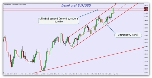 Jak jsme předpokládali, došlo v minulém týdnu k proražení hranice 1,4250. Momentálně se pár EUR/USD pohybuje kolem další silné cenové úrovně 1,4450, která již několikrát v minulosti znamenala zastavení pohybu nebo obrat trendu. Protože se pár pohybuje v uptrendovém kanálu, můžeme očekávat mírnou korekci nebo pohyb do strany. Předpokládáme menší korekci k úrovni kolem 1,4400, kde se nachází střed uptrendového kanálu. Následně pak další posilování eura. Důležité úrovně 1,4450 a střed kanálu kolem 1,4400.