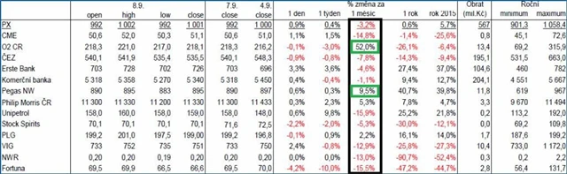 Jde o hvězdu posledních týdnu O2 Czech Republic (možnost mimořádné výplaty hotovosti akcionářům) a také Pegas Nonwovens, které začala odkupovat své akcie. Většina ostatních titulů je za uplynulý měsíc ve ztrátě, byť některé, například obě bankovní akcie, jen v mírné.