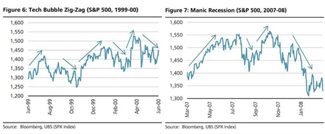 Na vrcholu trhu ale typičtěji dochází po delší dobu k divokému střídání nálad a denních, někdy i týdenních pohybů. Julian Emanuel z UBS to již v lednu ve své zprávě ilustroval právě na posledních dvou potvrzených vrcholech amerického trhu v letech 2000 a 2007.