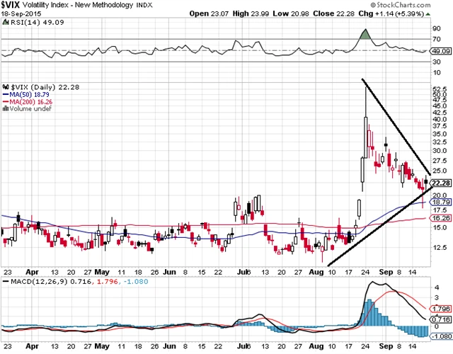 Index volatility VIX zůstává i přes průběžný pokles z hladin nad 30 body pro akcie v nepříznivém pásmu. Pozitivní by byl jeho sestup pod 19 bodů. Páteční nárůst volatility lze částečně přičíst také takzvanému quadruple witching, kdy vypršely opce na futures, indexy i akcie, které za poslední období byly, vzhledem k turbulencím na trzích pochopitelně, cenově velice široce rozprostřené. Jejich vypořádání tak znamenalo větší výkyvy, než by mohlo odpovídat "pouhému" potvrzení nejistého ekonomického výhledu po čtvrtečním vyjádření FOMC.